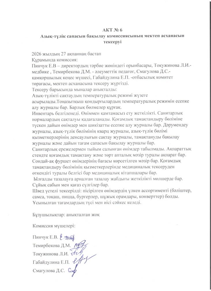 АКТ №6 Азық-түлік сапасын бакылау комиссиясының мектеп асханасын тексеруі