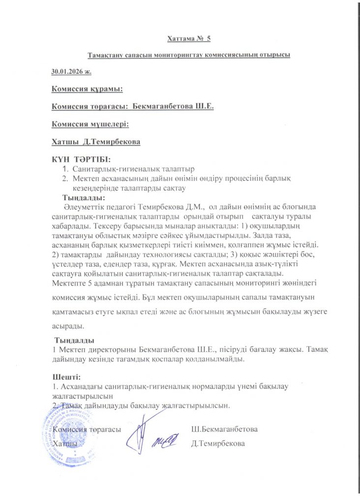 Хаттама № 5 Тамақтану сапасын мониторингтау комиссиясынын отырысы 30.01.2026 ж.