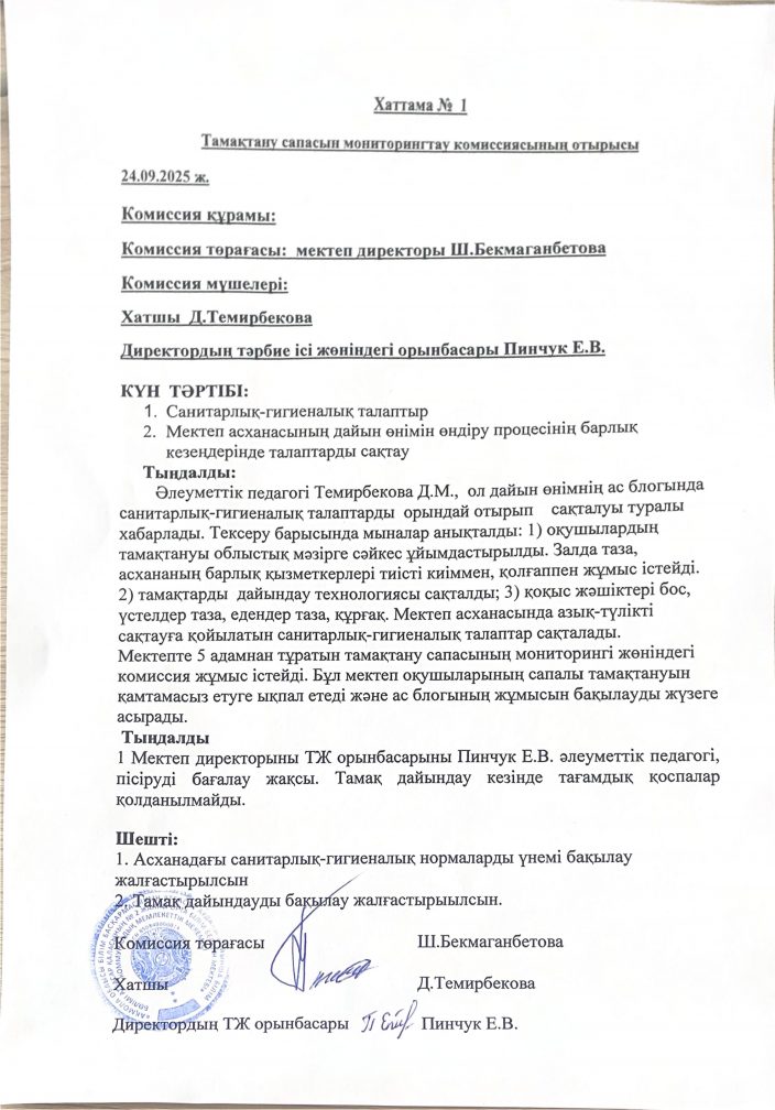 Хаттама №1. Тамақтану сапасын мониторингтау комиссиясының отырысы