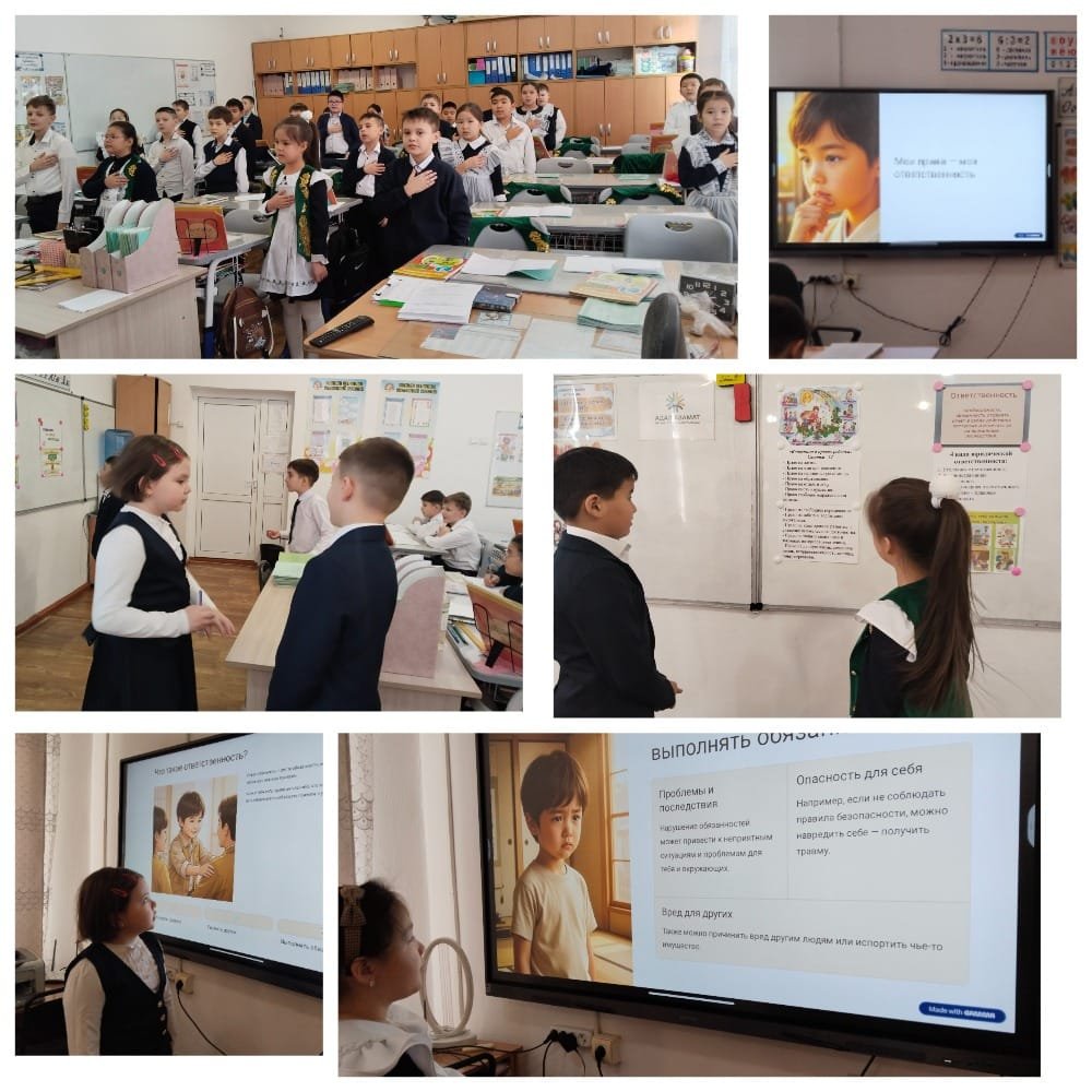 Бүгін 3-Б сыныпта мектеп қабырғасынан бастап қазіргі заманғы азамат болу дегеніміз не екені туралы маңызды және мазмұнды әңгіме болды. Сынып сағатының тақырыбы - «Менің құқықтарым мен жауапкершілігім» - балалар арасында қызу қызығушылық пен белсенді пікірталас...