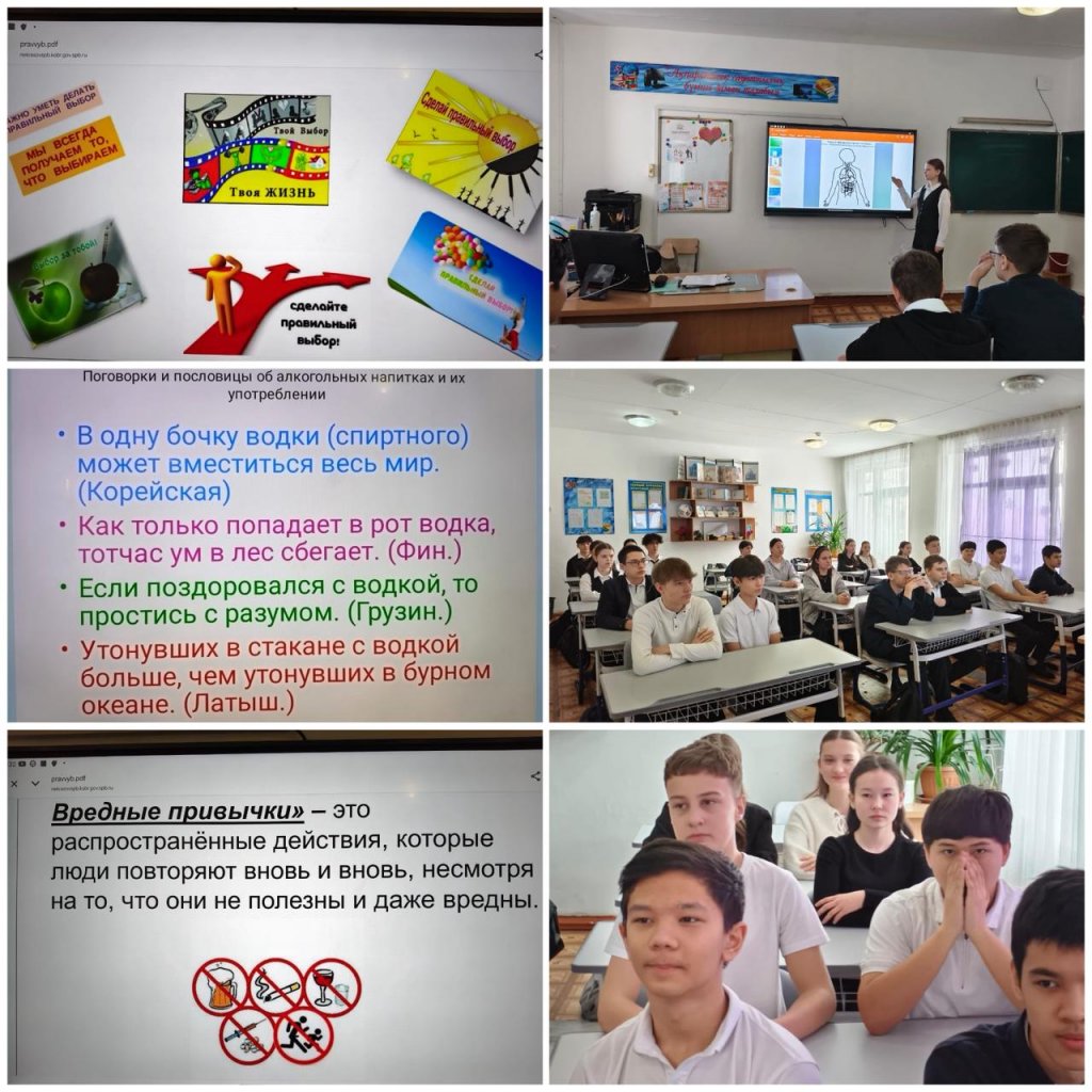 16 ақпан күні 8 А сынып оқушыларымен вейптердің, алкогольдің және есірткі заттарының зиянын ұғындыру, сондай-ақ өз денсаулығына жауапкершілікпен қарау көзқарасын қалыптастыру мақсатында «Темекі шегудің, вейптердің, алкоголь мен есірткінің зияны» тақырыбында сынып сағаты өткізілді. Ашық диалог форматында балалар вейп пен жеңіл алкогольдің «қауіпсіздігі» туралы аңыздарды талқылап, психоактивті заттарды қолданудың салдарының нақты мысалдарын қарастырды. Балалар талқылауға белсенді қатысып, өз пікірлерін білдірді және зиянды әдеттерге «жоқ» деп айта білу қаншалықты маңызды екендігі туралы ойларымен бөлісті. Денсаулық - адамның басты құндылығы, табысты оқудың, белсенді өмірдің және болашақ жетістіктердің іргетасы екендігіне ерекше назар аударылды. Сынып сағаты барысында оқушылар салауатты өмір салтын таңдау - мінез күші мен өз болашағы үшін жауапкершіліктің көрінісі деген қорытындыға келді